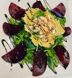 Oven roasted beets, arugula, goat cheese, balsamic dressing, mixed nuts.